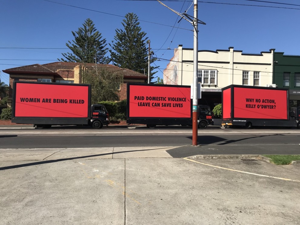 Рекламный триптих гласил: «Женщин продолжают убивать», «Оплачиваемый отпуск по семейным обстоятельствам может спасти жизни» и «Почему бездействуем, Келли О’Двайер?»