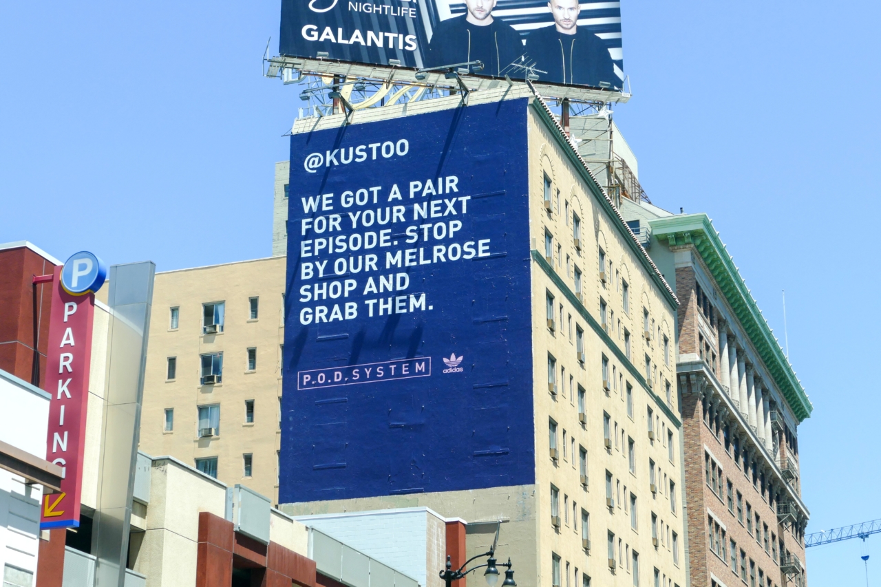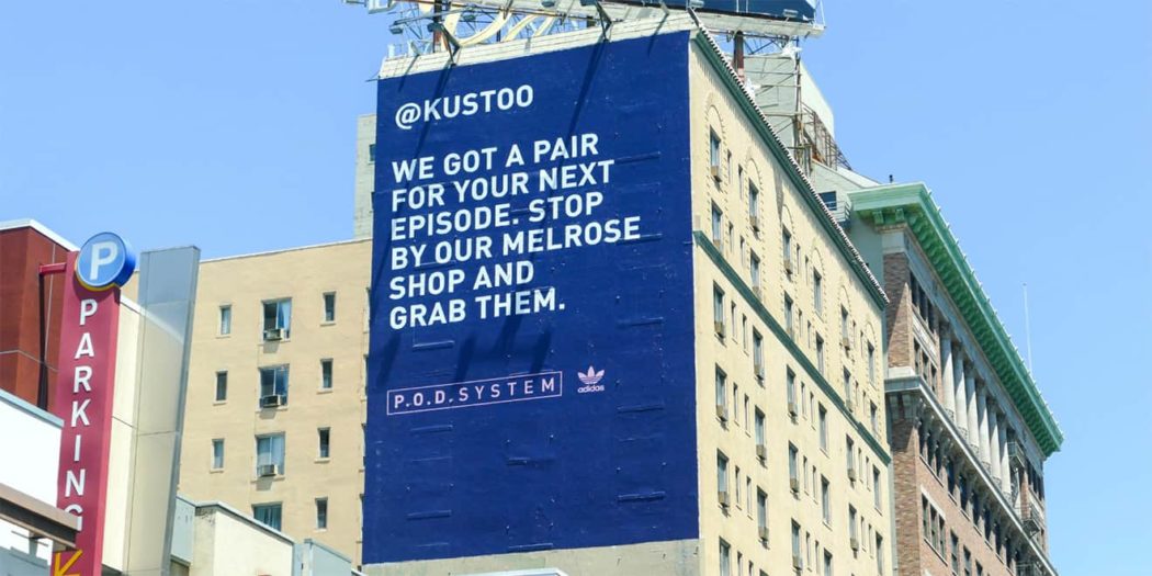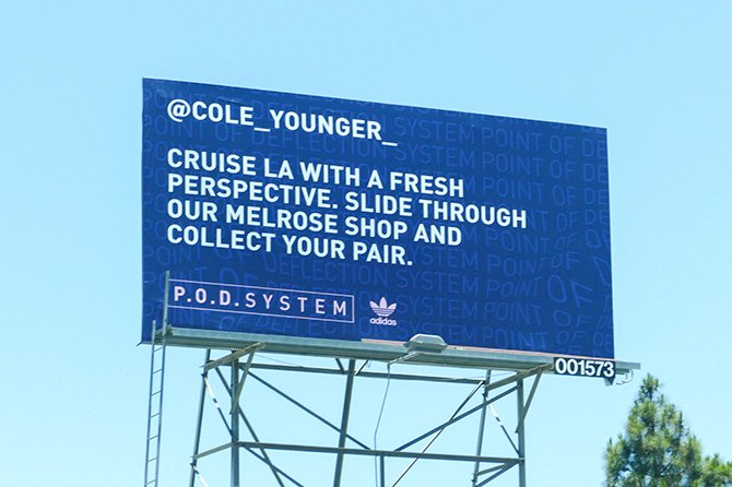 Adidas Originals для создания ажиотажа при запуске новой линейки кроссовок P. O. D. System в США привлек инфлюенсеров. При этом бренд не стал рассылать звездам социальных медиа коробки обуви в надежде на публикации. Вместо это Adidas провел out of home кампанию, персонально адресованную нескольким агентам влияния в Нью-Йорке и Лос-Анджелесе.