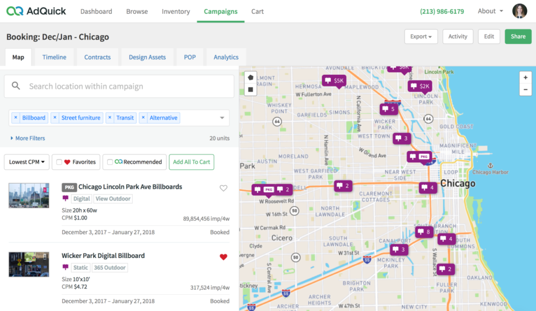 AdQuick предоставляет рекламодателям доступ к инвентарю порядка тысячи американских операторов. Рекламодатели могут сосредоточиться на поиске локаций в определенном регионе, определить бюджетные рамки, подключить источники данных и инструменты анализа и оценки эффективности кампаний. Например, Google Analytics и средства распознавания изображений отслеживают количество людей, которые посещают веб-сайт бренда или фотографируют рекламу и затем публикуют ее в Instagram, Facebook или Twitter. С помощью AdQuick рекламодатели могут настроить геозонирование, чтобы показывать мобильную рекламу людям, находящимся вблизи билбордов и затем анализировать их поведение.