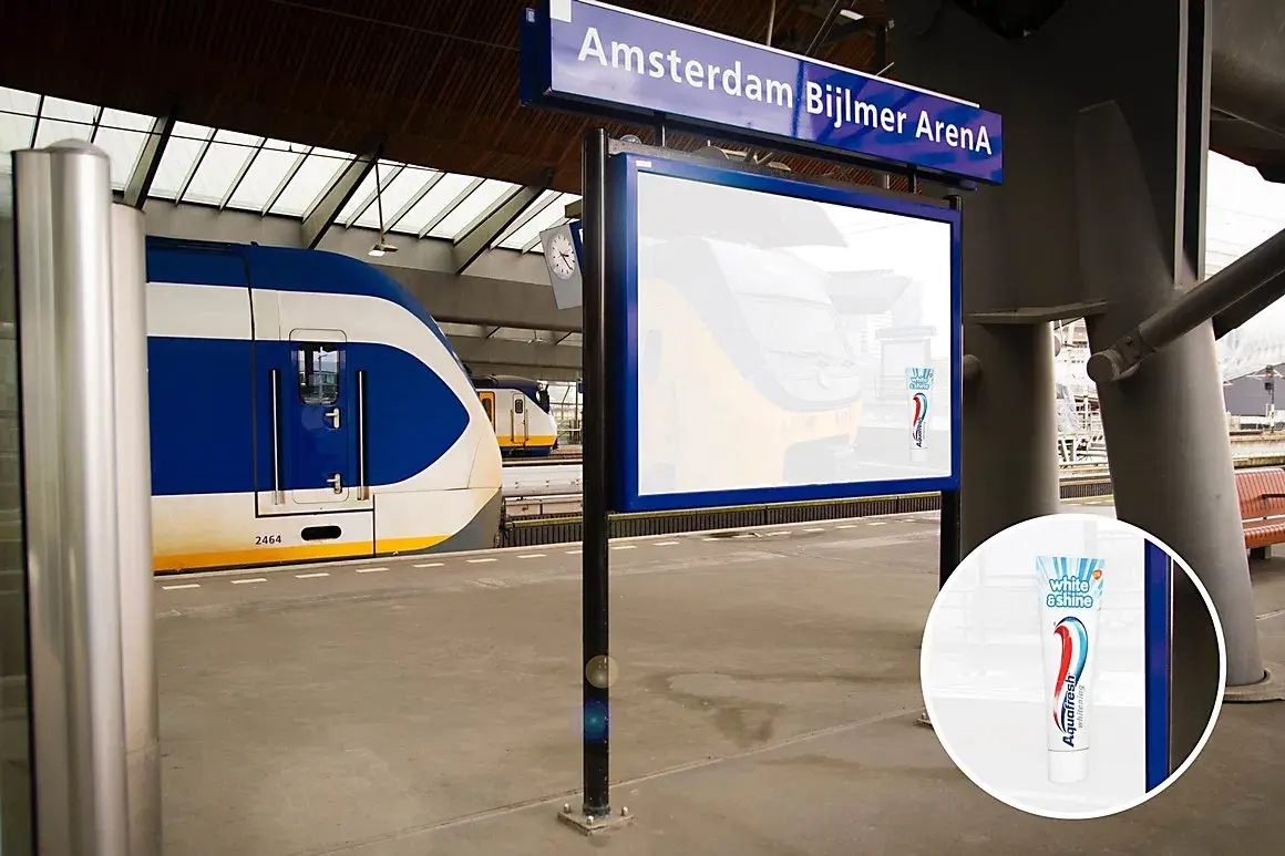 Aquafresh использовал пустующие рекламные плоскости на железнодорожных станциях в Амстердаме, Утрехте, Роттердаме и Гааге в партизанской OOH кампании зубной пасты White & Shine.