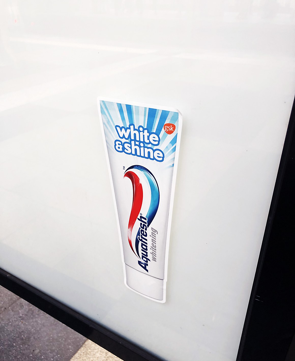 Наклейки после снятия не оставляли следов, как и подобает рекламе Aquafresh. Отклеивались они легко, оставляя лишь хорошее настроение от ловкой партизанской OOH кампании.