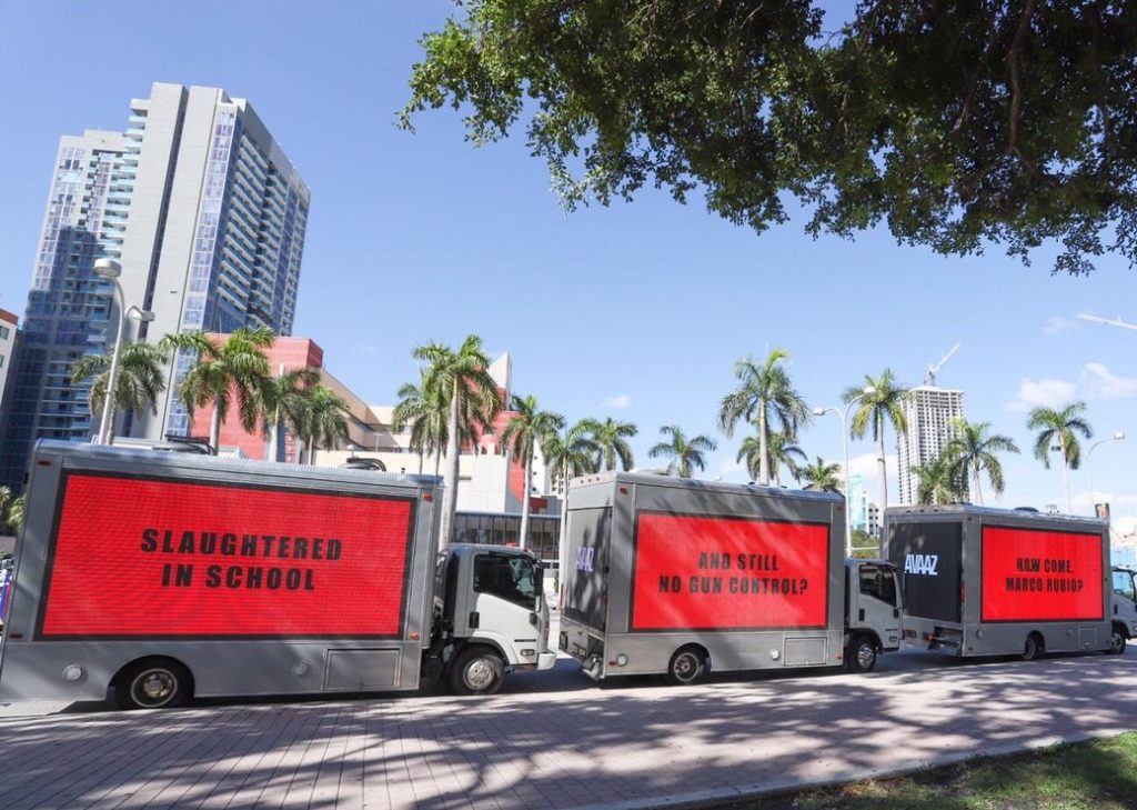 Глобальная общественная организация «Авааз» почерпнула вдохновение из фильма «Три билборда на границе Эббинга, Миссури» для кампании по ужесточению законодательства в области оборота огнестрельного оружия во Флориде. Общественное противостояние обострилось после массового убийства в средней школе Марджори Стоунман Дуглас в Паркленде (округ Броуард, штат Флорида).