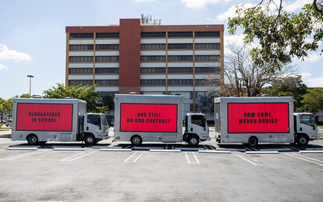 Триптих «Убиты в школе», «Контроля за оружием все так же нет», «Как же так, Марко Рубио?» повторяет идею оскароносного фильма Мартина Макдонаха, героиня которого вынуждена подстегивать правосудие через механизм пристального общественного внимания, направляемого с помощью билбордов.