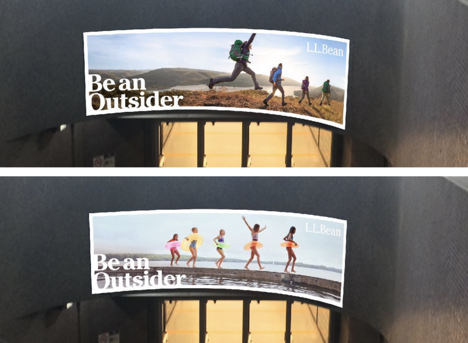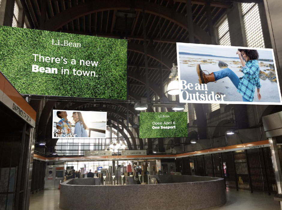 Олдовый производитель товаров для туризма L.L.Bean призывает жителей и гостей Бостона с рекламоносителей на вокзале Бэк-Бэй «Стать „аутсайдерами“» (‘Be an Outsider’).