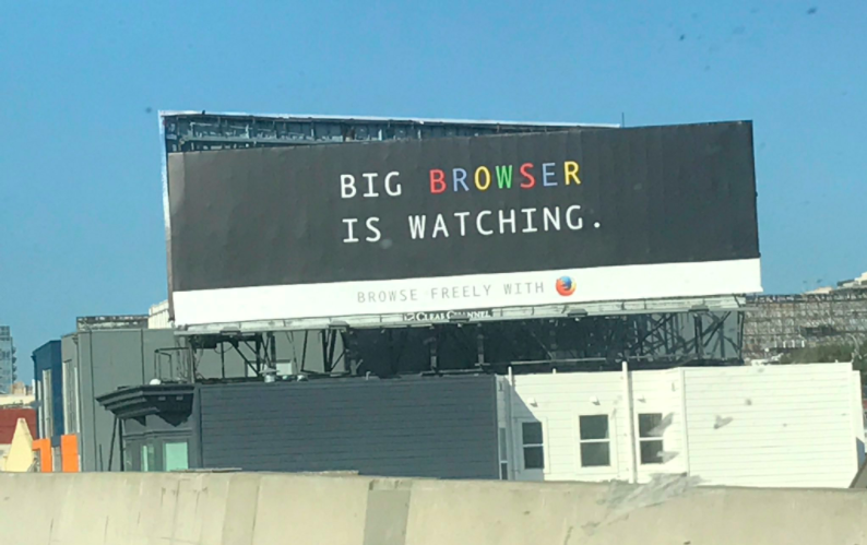 Компания Mozilla, разрабатывающая браузер Firefox, разместила в Сан-Франциско рекламный баннер, поднимающий проблему слежки в интернете. На нём написано: «Большой браузер следит. Свободно просматривайте [интернет] вместе с Firefox». При этом слово «браузер» было окрашено в фирменные цвета Google Chrome — красный, жёлтый, зелёный и синий.