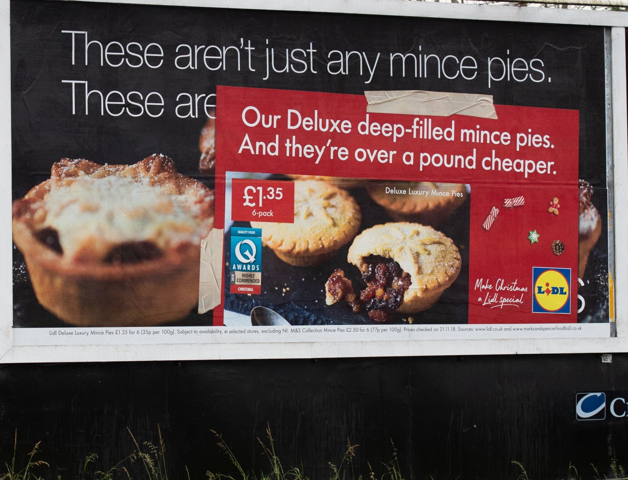 В рамках кампании креативщики из агентства TBWA прибегли к «партизанскому» приему. Они «перекрыли» своей рекламой постеры конкурентов. Cоздалось впечатление, что реклама Lidl наклеена скотчем прямо поверх сюжетов сетей Waitrose и Marks & Spencer. На самом деле это лишь коллаж, сделанный в фоторедакторе. Фон — предложение конкурентов, сверху — тот же товар Lidl, но более дешевый. Таким образом они сравнили популярные в Рождество продукты — пироги, индейку, имбирный ликер.