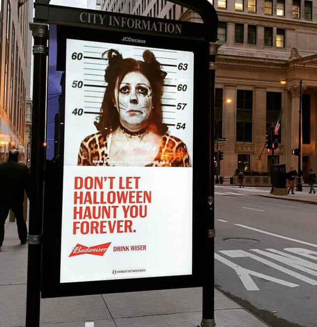Budweiser обновил кампанию по ответственному употреблению алкоголя к Хэллоуину Drink Wiser. В рамках капании бренд AB InBev использовал снимки реальных людей, которые были задержаны за безответственное употребление алкоголя на Хэллоуин. Пивной бренд вдохновляет пользователей следовать за твиттер-аккаунтом @BudweiserUSA, чтобы получать напоминания в реальном времени об употреблении воды между кружками пива.
