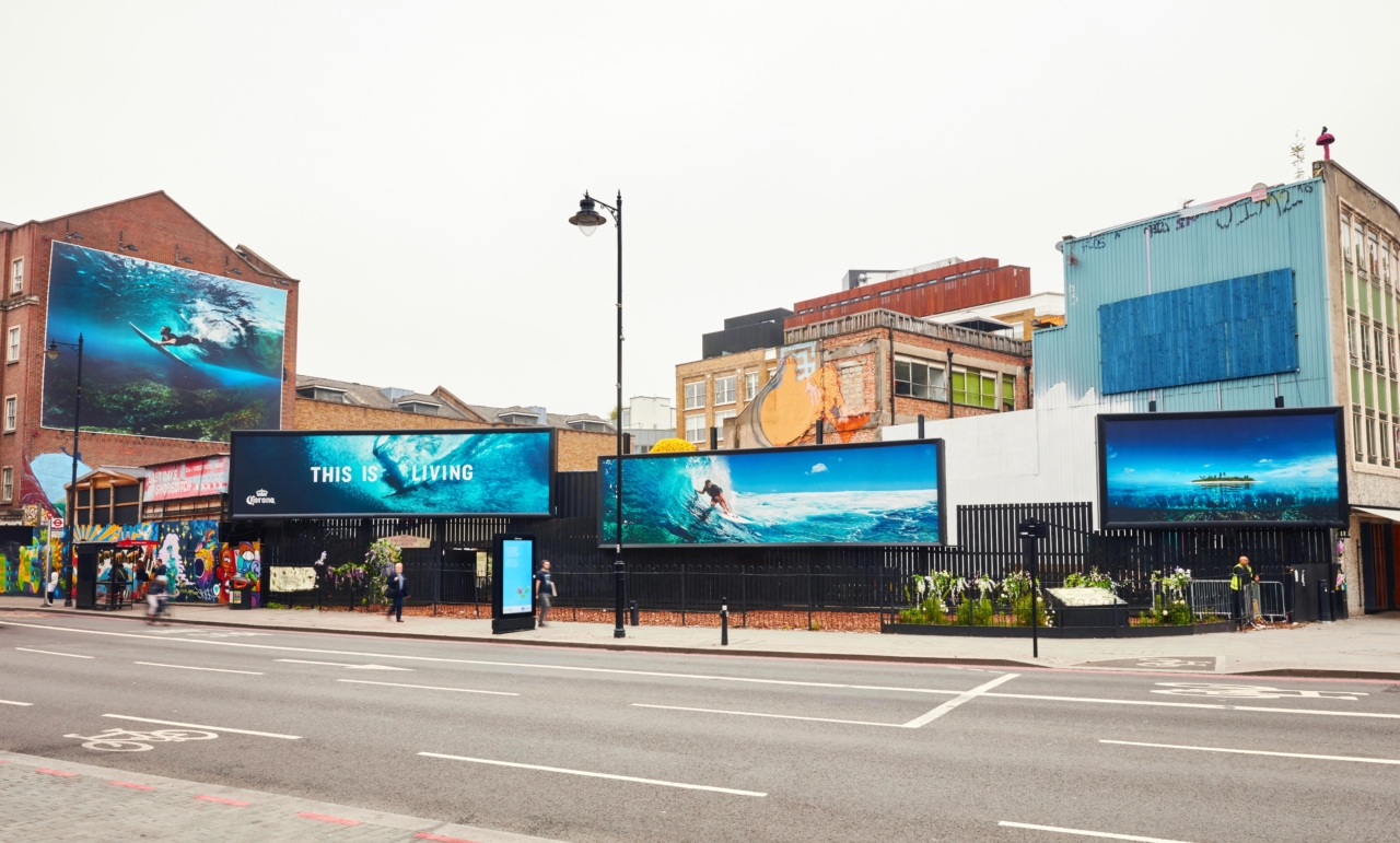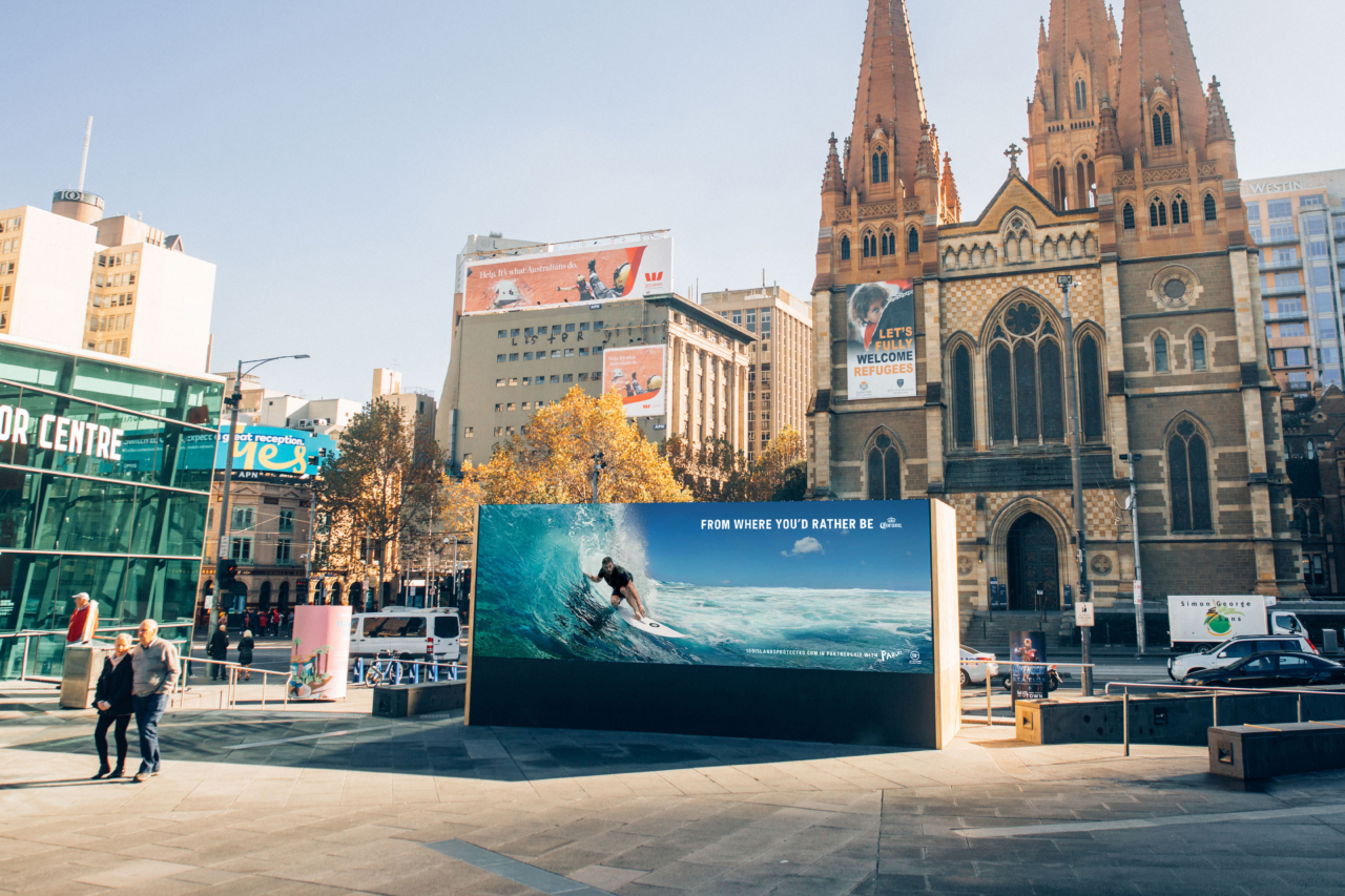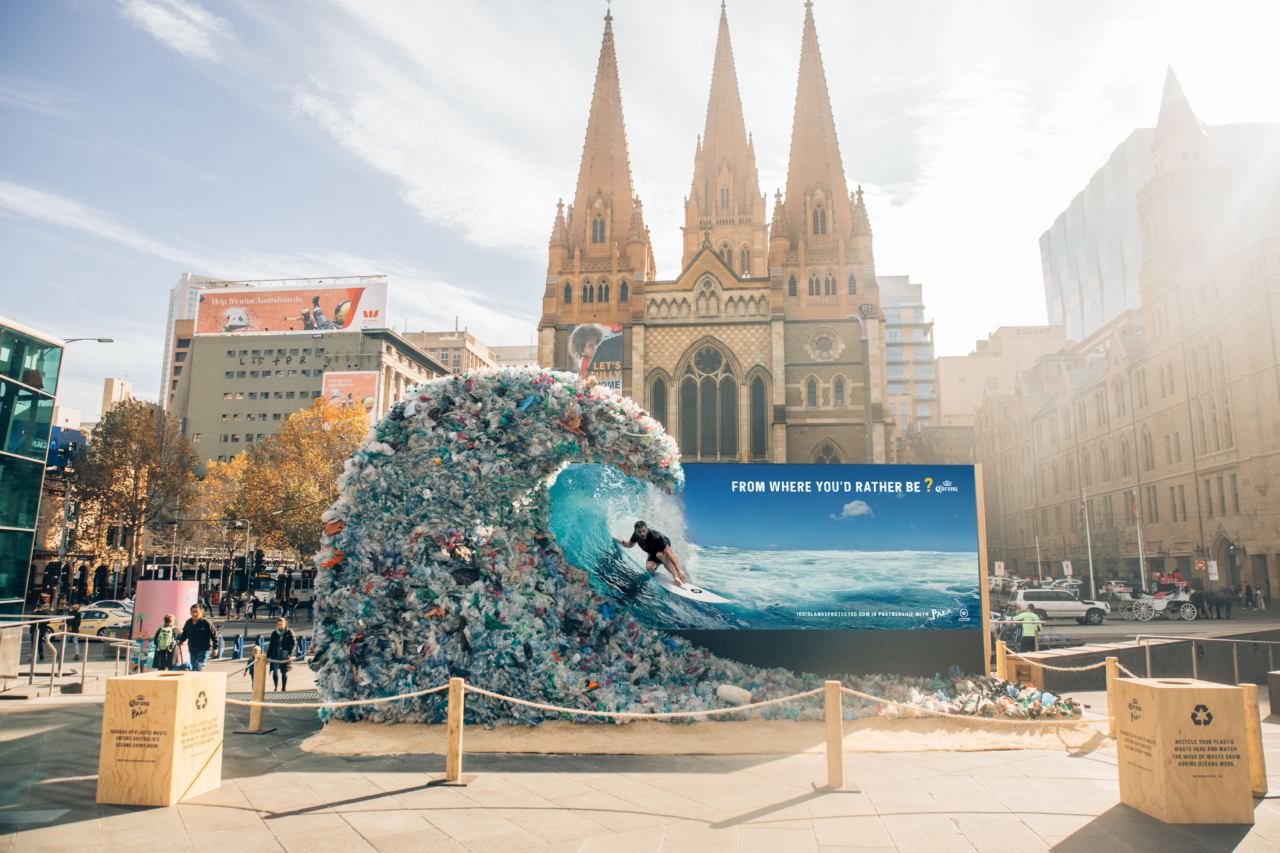 Компания установила на площади Федерации в Мельбурне зрелищную out of home конструкцию: актер Крис Хемсворт скользит по стенке океанской волны, превращающейся в груду пластиковых бутылок. Причем груда — слово не точное, это полуторатонная свалка. Такое количество пластикового мусора ежедневно попадает в окружающие Австралию воды.