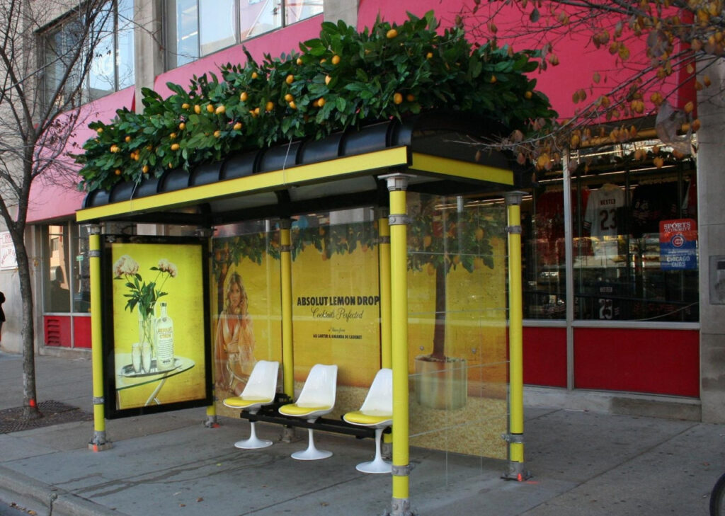 В 2010 году водочный бренд Absolut в рамках кампании “Drinks” забрендировал автобусные остановки в Чикаго. Агентство TBWA\Chiat\Day разработало три самобытных дизайна, соответствующих разнообразным ароматам напитка. Одна из остановок, “Lemon Drop”, отличалась еще и необычной крышей — там разбили цитрусовый сад.