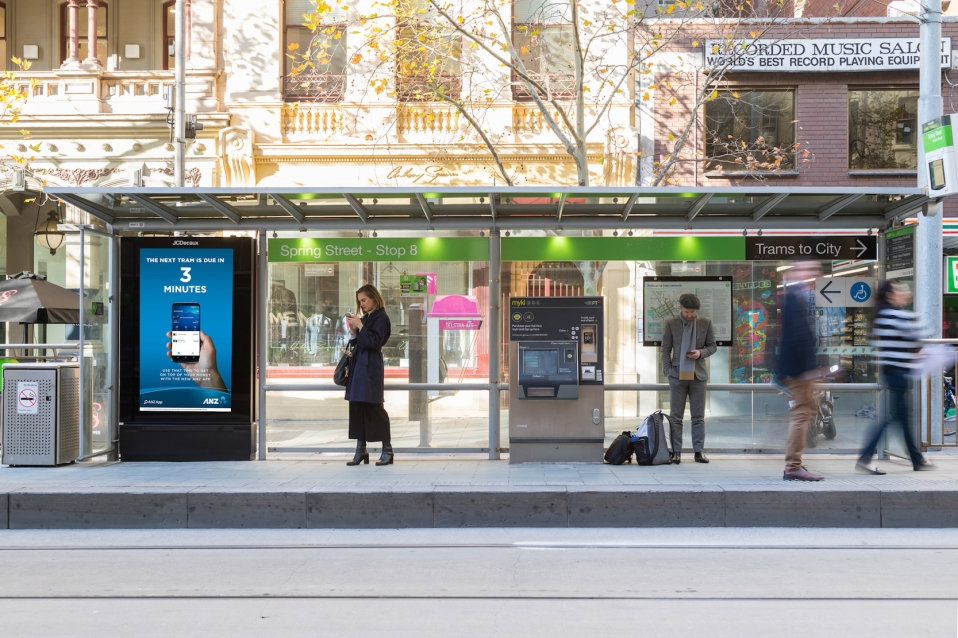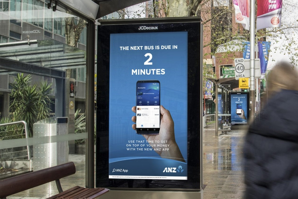 В 2018 году финансовая группа ANZ провела в Сиднее, Мельбурне и Брисбене кампанию, в которой преимущества мобильного приложения ANZ привязывались к расписанию движения общественного транспорта. На установленных в павильонах ожидания экранах отображалось время прибытия автобуса или трамвая. Рекламные сюжеты строились по формуле: «Следующий автобус будет через X минут. Используйте это время, чтобы управлять своими финансами в новом приложении ANZ».