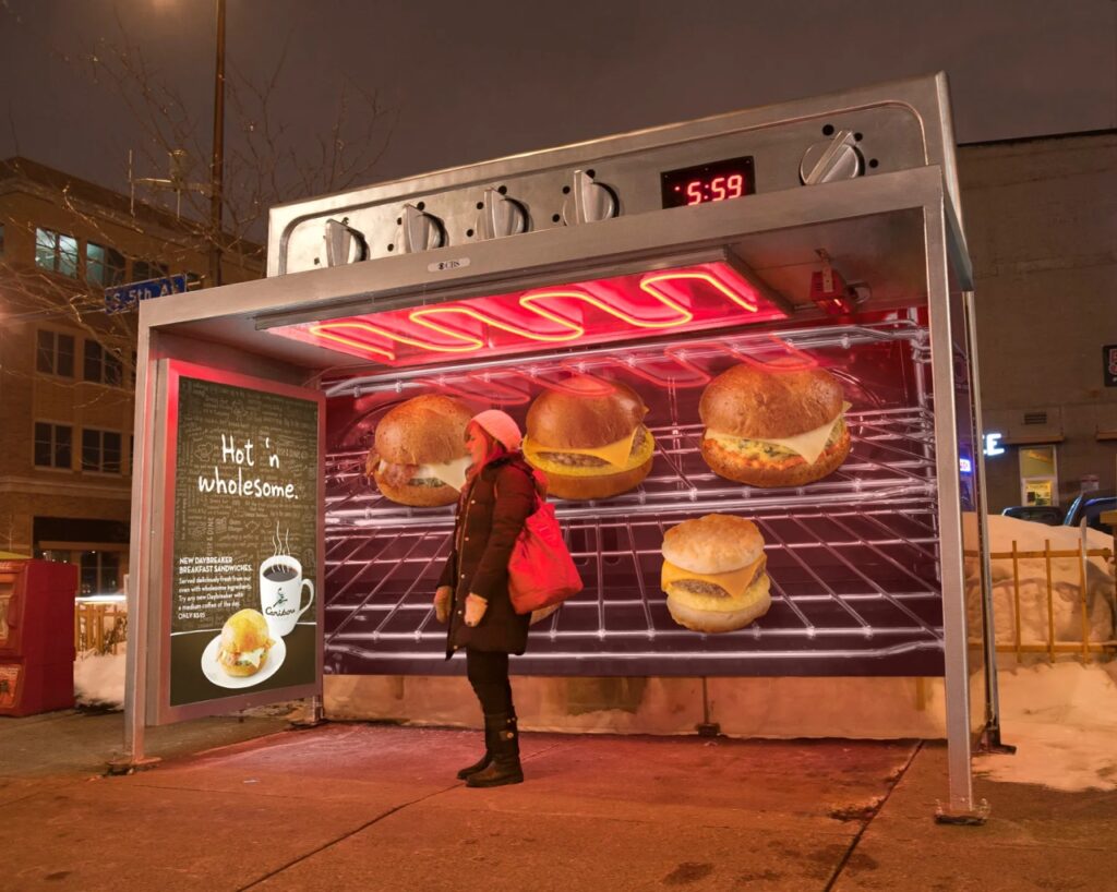 Американское рекламное агентство Colle MacVoey создало эту автобусную остановку для повышения осведомленности о кофейне Caribou Coffee. Зимой остановка превращалась в огромную духовку, одновременно дарующую тепло ожидающим автобус пассажирам и продвигающую фирменные блюда заведения.