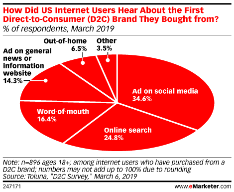 И это не удивительно, ведь часть потребителей узнают о таких компаниях — в дополнение к поисковой выдаче и соцмедиа — через сарафанное радио или рекламу в метрополитене. Согласно опросу, проведенному в марте 2019 г. с помощью сервиса Toluna, почти каждый четвертый интернет-пользователь в США впервые услышал о D2C-бренде, продукцию которого приобрел, из традиционных каналов маркетинговой коммуникации, таких как out of home реклама и сарафанное радио.