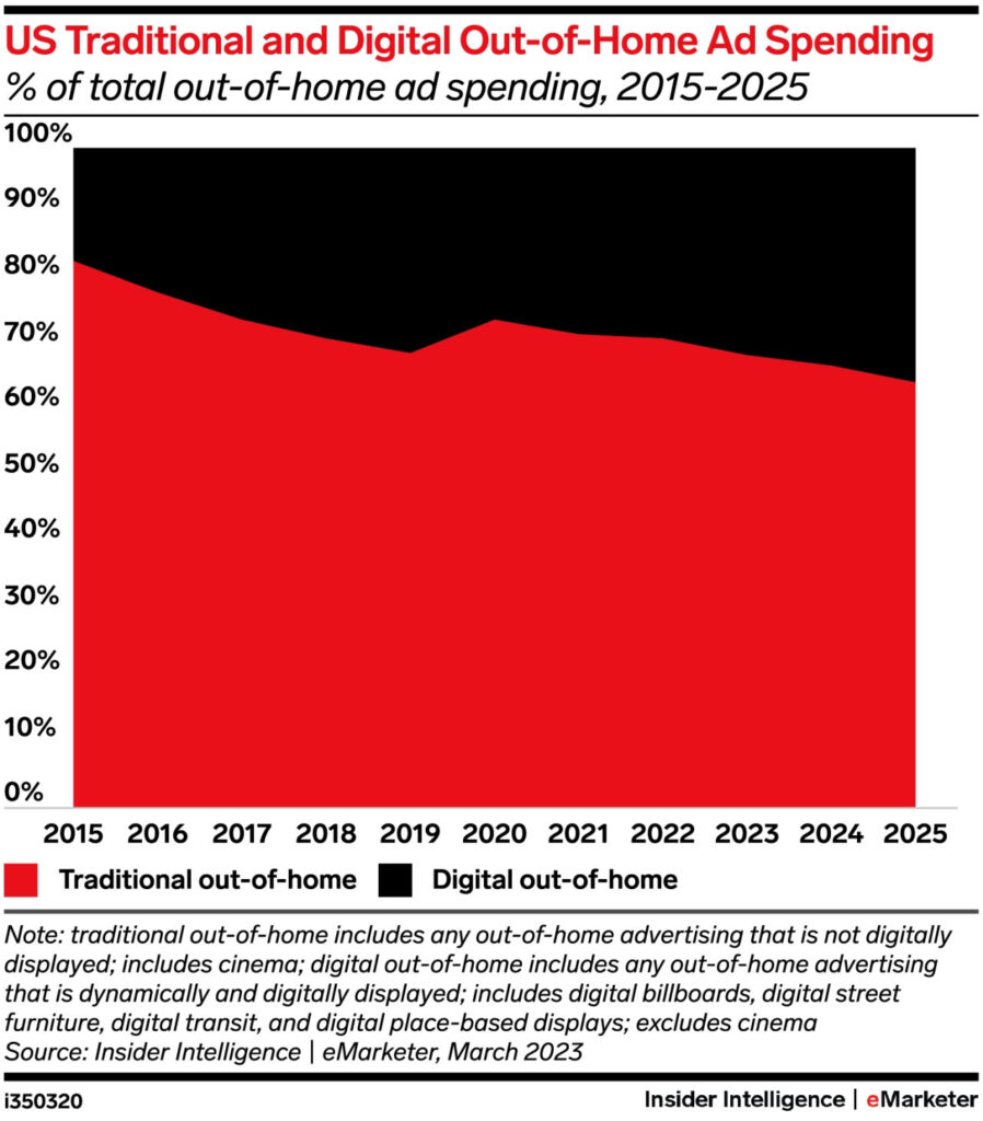 У 2023 році частка DOOH становитиме 31,4% від всіх інвестицій в OOH-рекламу, що відповідає допандемічному рівню. Цьогоріч на DOOH буде витрачено більше рекламних доларів, ніж у 2019 році. Але з урахуванням інфляції обсяг інвестицій в DOOH все ще менше, ніж до пандемії, що свідчить про зменшення частки OOH-реклами в загальній структурі американського медіаринку.
