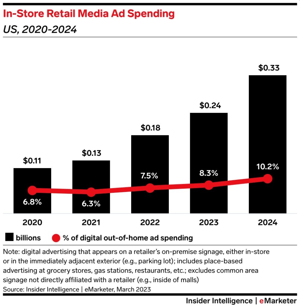 Цифровізація трансформує можливості підприємств роздрібної торгівлі розміщувати рекламу на полицях, торцевих стелажах, дверцятах холодильників та прикасових зонах. У 2024 році на інвентар в закладах торгівлі припадатиме десята частина витрат на DOOH в США. Це свідчить про збільшення обсягу рекламного інвентарю у фізичних магазинах.