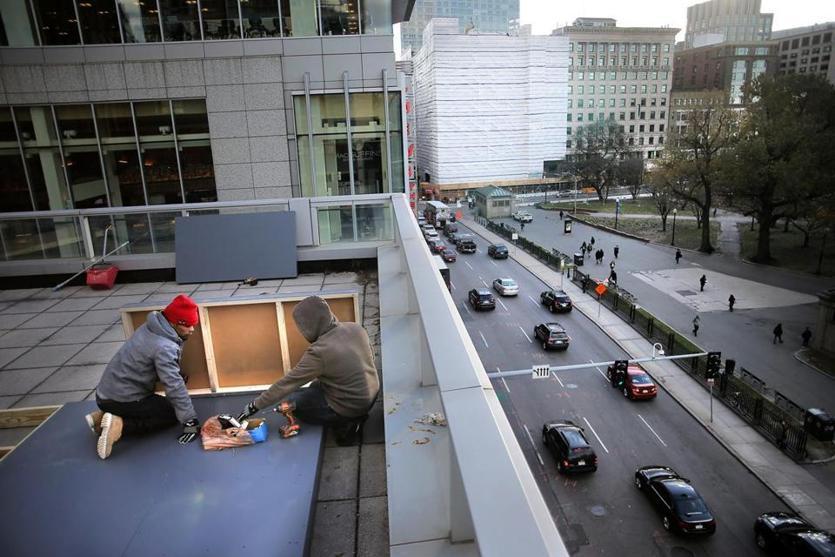 Рабочие на крыше соседнего здания устанавливают проекционное оборудование. Фото: Лейн Тернер/The Boston Globe