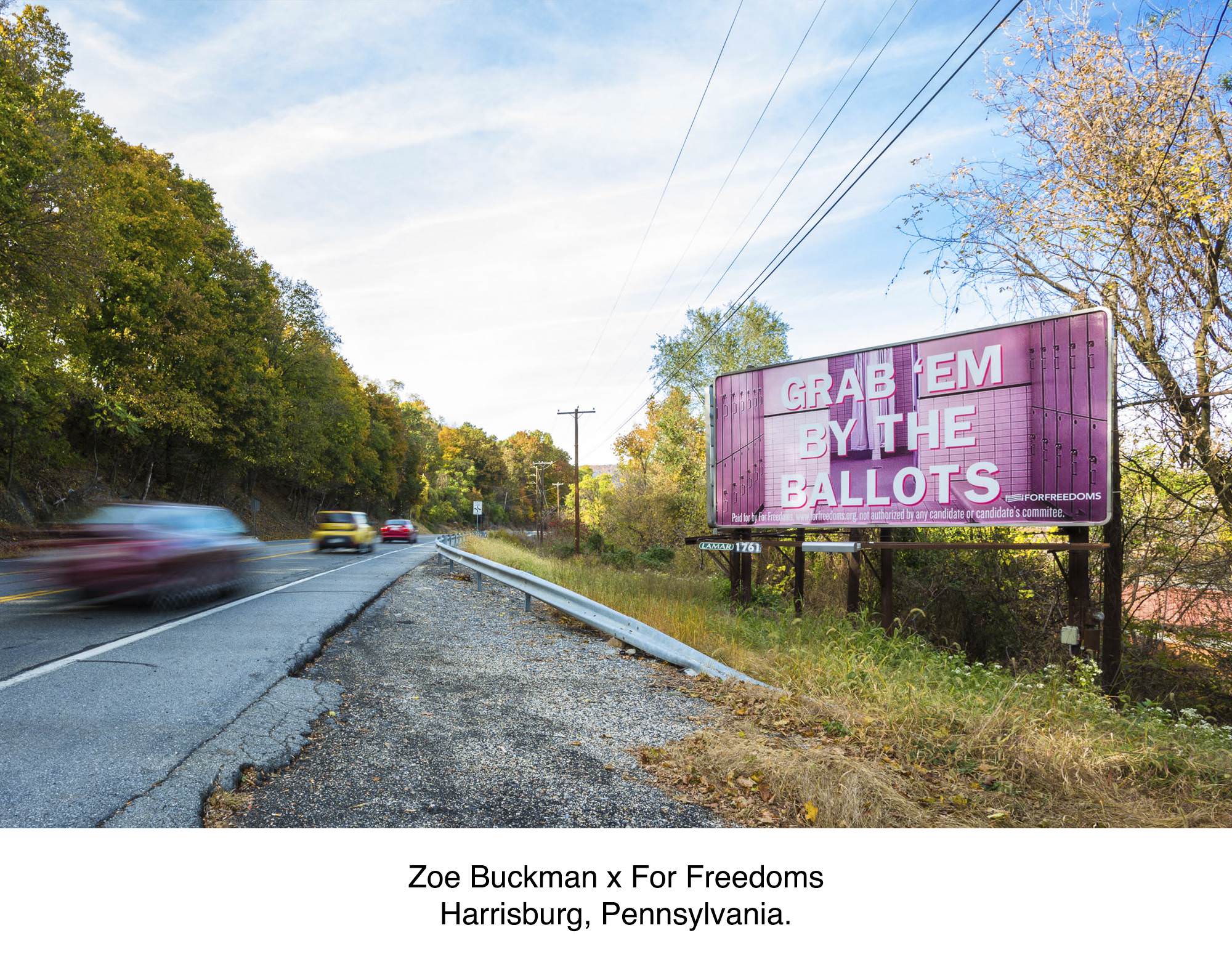 Тысячи билбордов по всей стране скоро будут украшены именами и фотографиями политиков — Штаты начнут готовится к осенним выборам в Конгресс. Однако новая кампания организации For Freedoms задействует out of home медиа не для продвижения кандидатов, а для стимулирования — с помощью искусства — общества к дискуссии и побуждения граждан участвовать в политической жизни. В рамках проекта с финансированием в размере 1,5 млн долларов For Freedoms заручилась поддержкой художников Сэма Дюрана, Тистера Гейтса и Мэрилин Минтер для графического оформления, а также руководства работой общественных собраний.