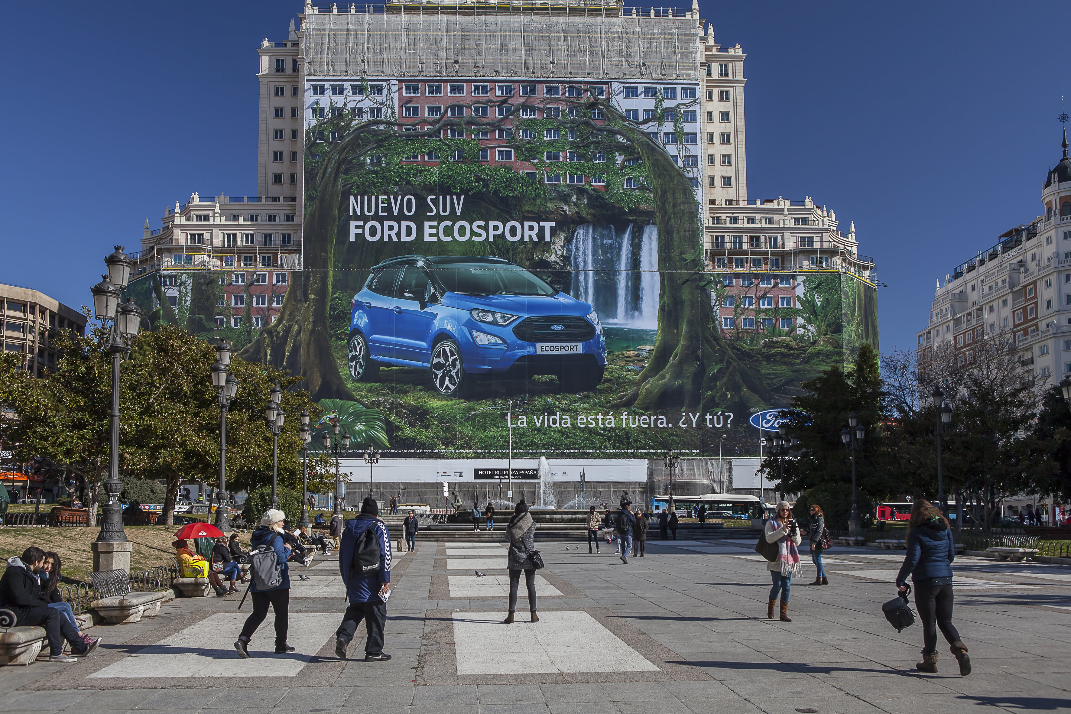 Огромный баннер появился на знаменитом доме «Испания» в центре Мадрида. 25-этажное здание высотой 117 метров построено в 1953 году и является одним из символов испанской столицы. Сейчас оно находится на реконструкции. Этим и воспользовались маркетологи Ford. Общая площадь полотна составляет 5265 квадратных метров. Это сопоставимо с площадью 20 теннисных кортов. Весит конструкция 2 тонны. Семь человек монтировали баннер в течение двух дней.