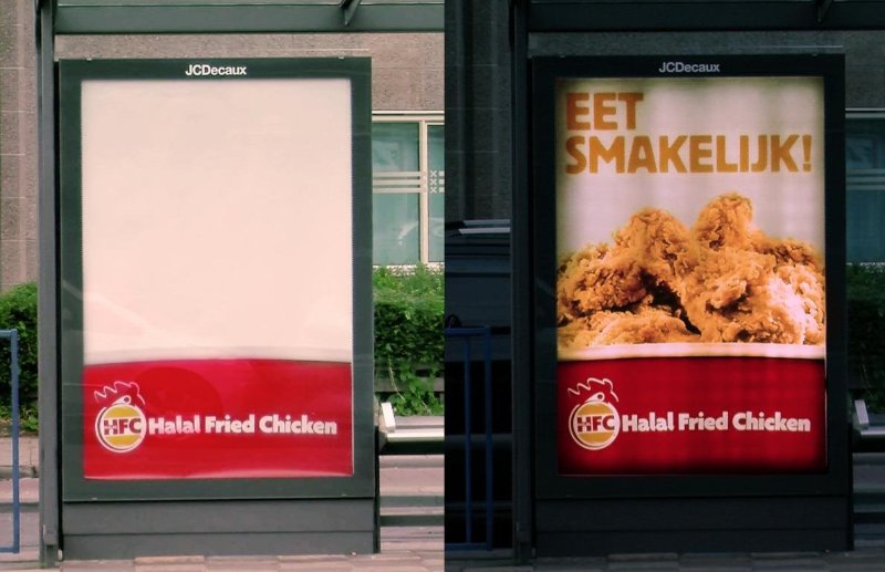 В дневное время рекламный носитель пуст, но, как только начинает темнеть, что означает завершение времени поста, появляется реклама с изображением халяльных куриных ножек в панировке.