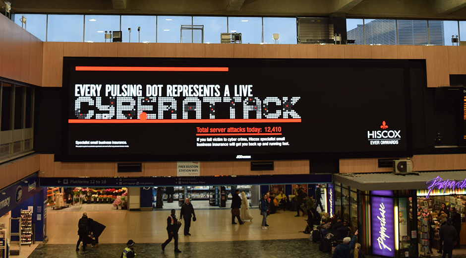 Задача DOOH кампании страховщика Hiscox — просто и доходчиво рассказать малому бизнесу о высокой вероятности пасть жертвой киберпреступников