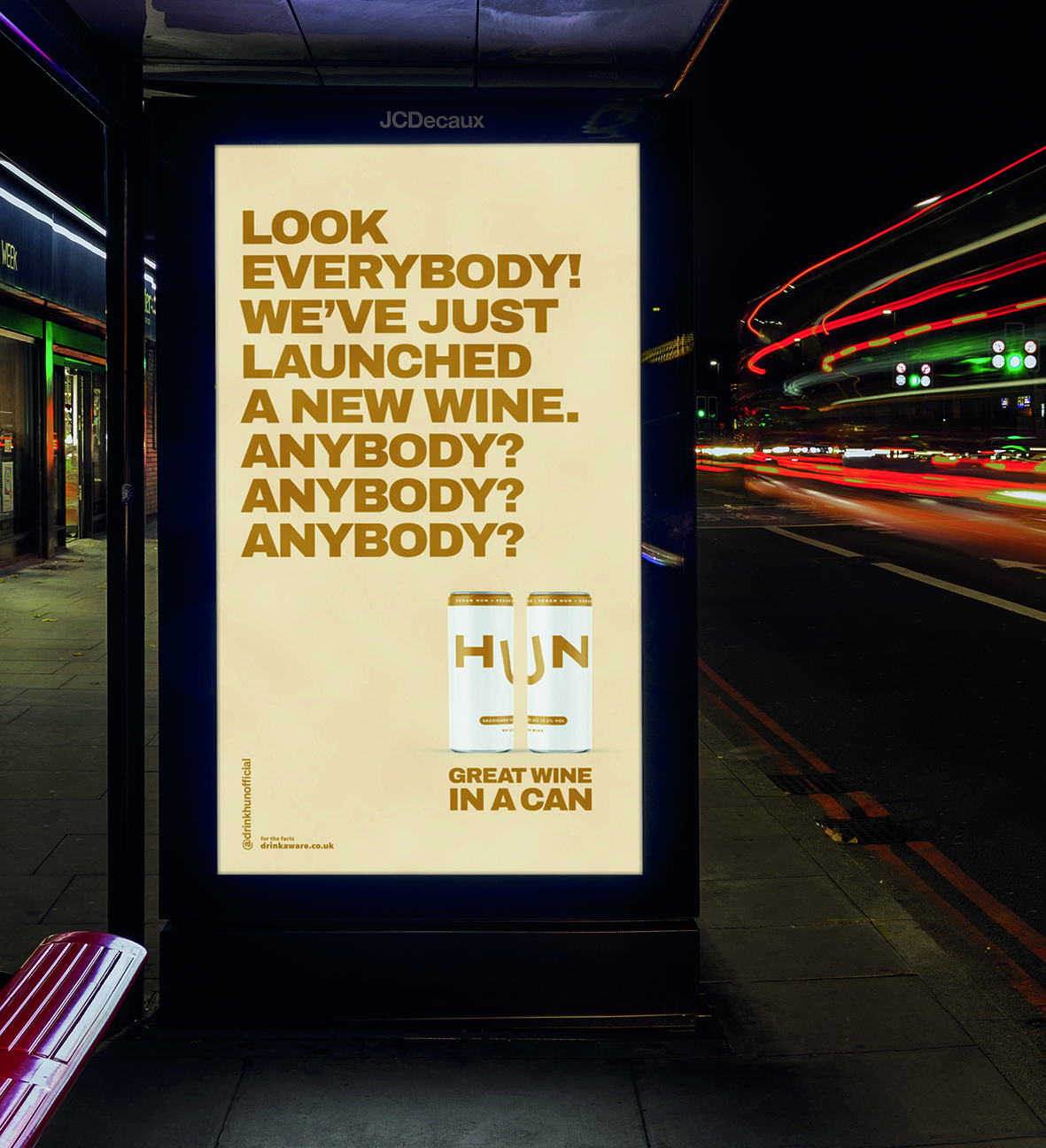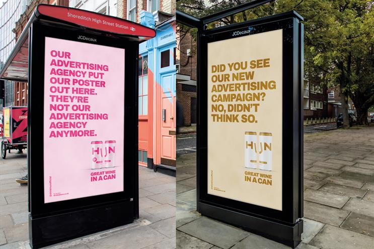 Первую OOH кампанию Hun создало креативное агентство TBWA\London. Это серия язвительных замечаний в духе: «Видели нашу новую рекламу? Походу, нет» или «Наше рекламное агентство разместило постеры здесь. Больше это не наше рекламное агентство».