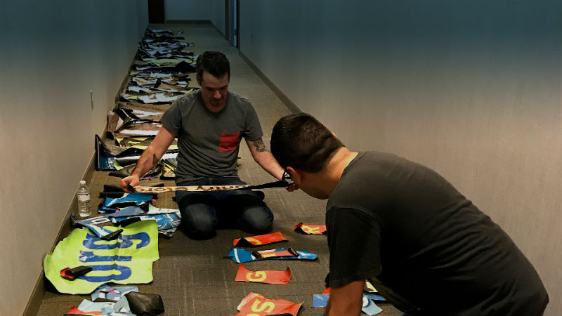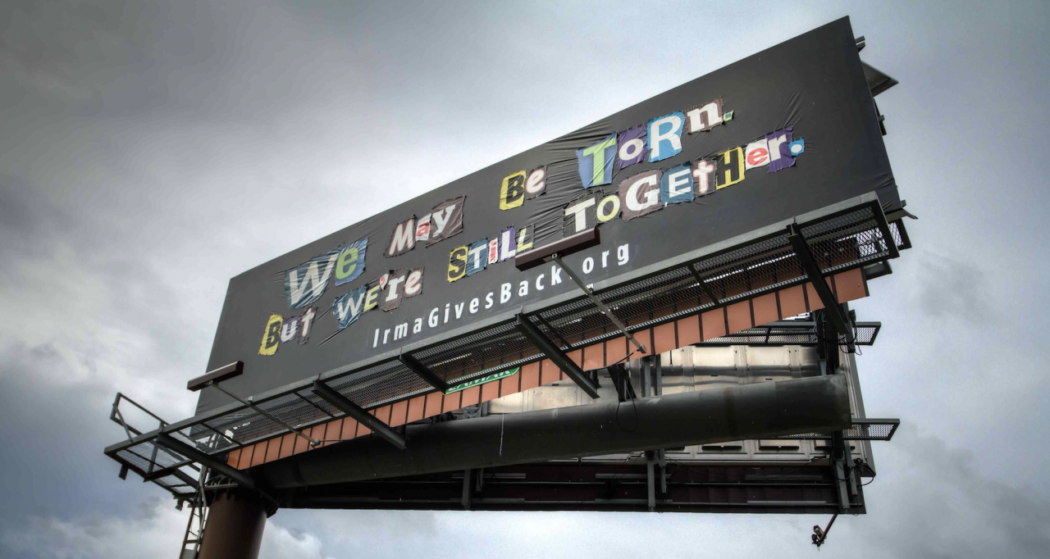 22squared использовали остатки разрушенных ураганом виниловых полотен, чтобы создать новые, призывающие посетить сайт IrmaGivesBack.org, где можно пожертвовать время или деньги для помощи.