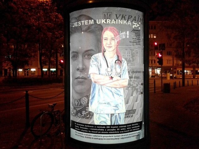 Українських заробітчанок вона намалювала на 200-гривневій купюрі із зображенням відомої української поетеси та письменниці Лесі Українки. А вгорі на плакатах напис польською: «Я — українка!»
