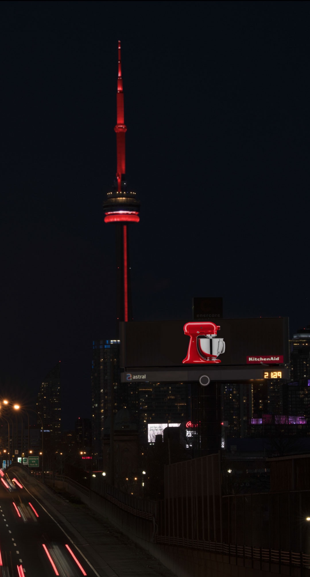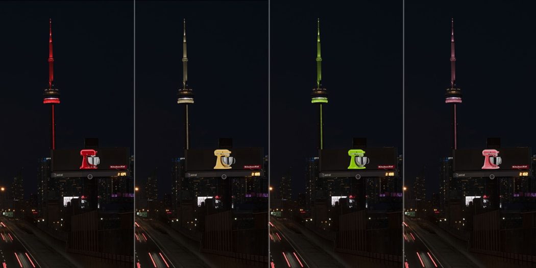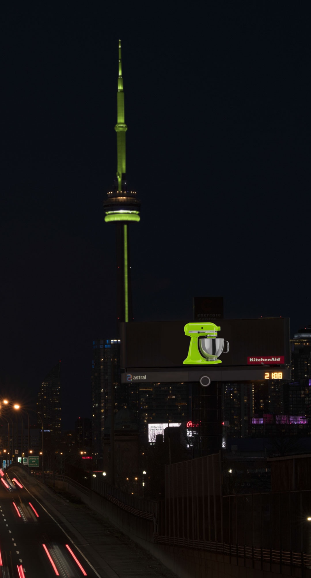 Рекламный щит компании находится рядом с одной из главных достопримечательностей города — башней CN Tower. На нем изображен миксер KitchenAid, который меняет цвет, подстраиваясь под подсветку башни. Ее регистрирует камера возле билборда, алгоритм выбирает наиболее подходящий оттенок из палитры моделей миксера, затем он выводится на цифровой экран. Компания хотела показать, что ее легендарный миксер так же, как и CN Tower, является иконой дизайна.