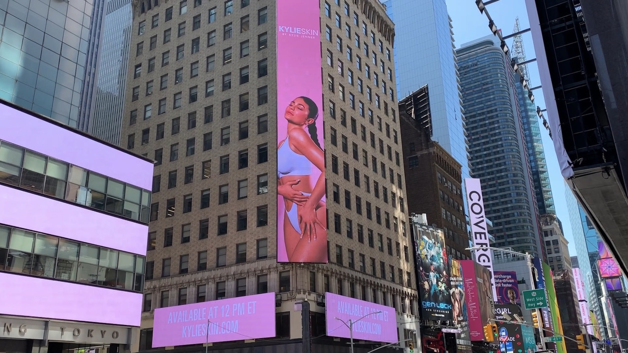 Кампания, анонсировавшая запуск косметического DTC-бренда Кайли Дженнер — Kylie Skin, прошла 22 мая на 5,8 тыс. экранов в более чем тысяче американских городов. Это результат совместных усилий открытой онлайн-платформы для поиска и покупки DOOH-инвентаря Adomni и 22 операторов OOH-рекламы (Lightbox, Clear Channel Outdoor, Lamar Advertising и др.). Кампания разместилась на билбордах, в торговых центрах и туристических мекках вроде Таймс-сквера.