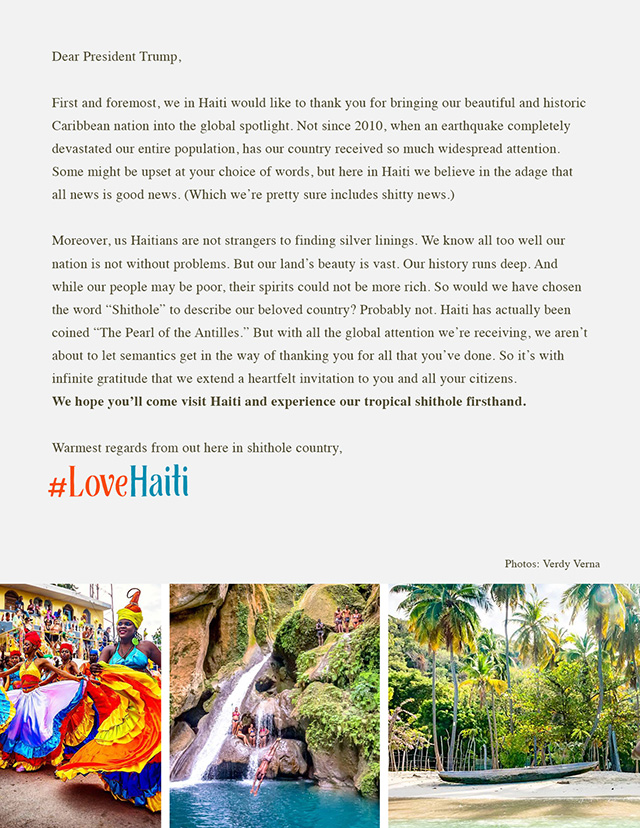 Также было составлено обращение к Дональду Трампу, которое креативный директор хотел бы разместить в «Нью-Йорк таймс». В обращении автор иронично обыгрывает слова президента США, приглашая его посетить Гаити.