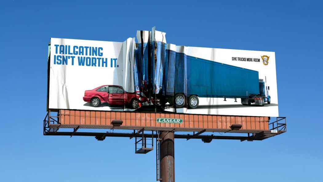 Подходите к созданию рекламы творчески. «Плоский» билборд — решение стандартное и вовсе не обязательно вводить его в абсолют. Рекламоноситель можно сделать трехмерным, добавить движущиеся элементы, анимировать, сделать интерактивным. Нет таких причин, согласно которым наружная реклама должна быть просто плакатом большого размера. Это шанс сделать что-то броское и запоминающееся, так что дерзайте. Преимущество — возможность получить дополнительный охват аудитории при освещении кампании новостными изданиями. Хорошей иллюстрацией такого развития событий служит наружная реклама Патрульной службы Колорадо, предупреждающая об опасности движения вплотную к впереди идущей машине (автор статьи выступал в роли креативного директора этой кампании, — прим. перев.). Эта работа попала в выпуски новостей множества телеканалов. Стоимость размещения трехмерной конструкции не сильно отличалась от обычного постера, но многократно окупилась за счет паблисити.