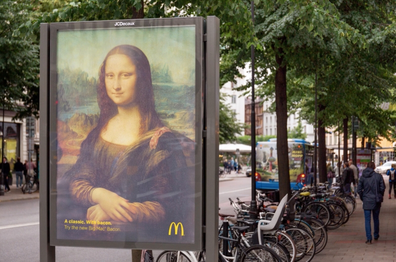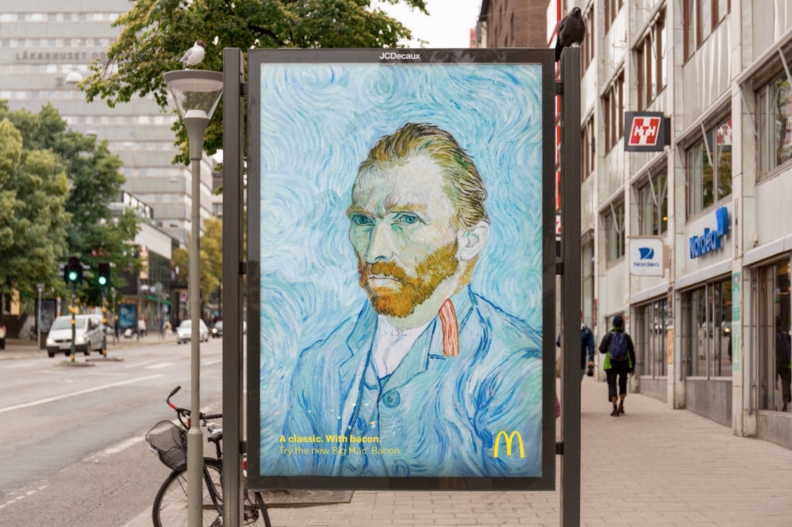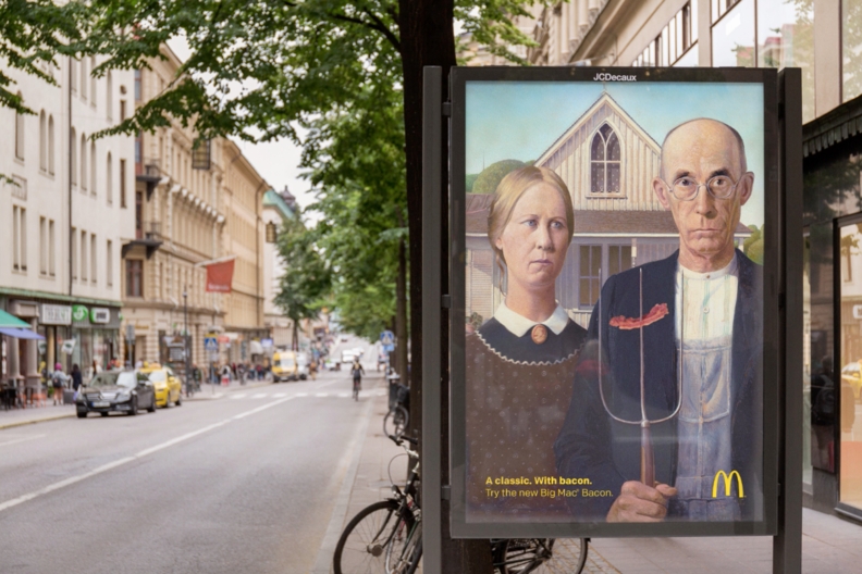 Компания разметила в наружной рекламе шедевры живописи — «Американскую готику» Гранта Вуда, «Мону Лизу» Леонардо да Винчи, а также «Автопортрет» Винсента Ван Гога. Однако на картинах появилась одна новая деталь — кусочек бекона из McDonald’s: на плече у Моны Лизы, за воротником у Ван Гога, на вилах у фермера.