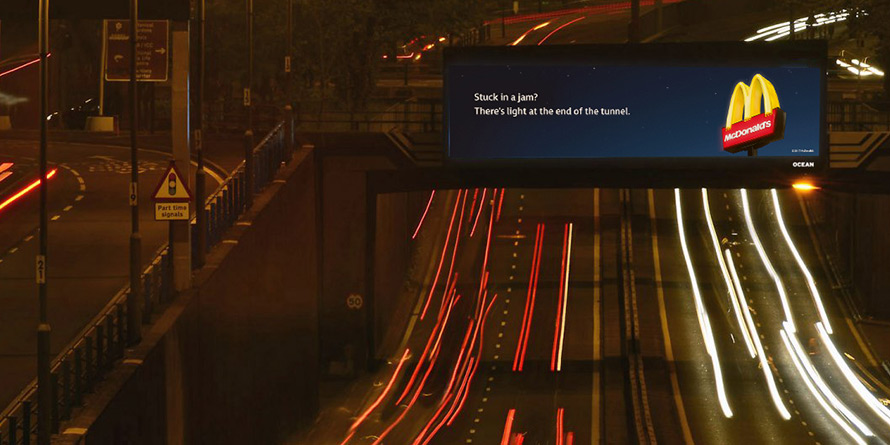 Сеть ресторанов быстрого питания и агентство Leo Burnett проводят в Великобритании заманчивую DOOH кампанию с таргетингом на водителей в часы пик. Когда дороги загружены не сильно, используются сюжеты с изображением Big Mac. Когда интенсивность дорожного движения возрастает, они сменяются на креатив с хорошо знакомыми «золотыми арками» и сообщением «Застрял в пробке? Виден свет в конце туннеля».