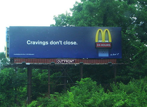 Щиты вдоль шоссе и автомагистралей сообщают водителям, где неподалеку можно поесть. Также они направляют пешеходные потоки в городской черте, ведь большинство людей не планируют заранее, где им перекусить. Вот почему билборды и другие OOH-форматы — идеальное медиа для обращения к тем, кто решает, где бы перекусить вне дома. Телереклама формирует склонность к определенной еде, «наружка» же направляет в конкретное место. Только представьте себе силу влияния билборда 3×6! Вот поэтому McDonald’s всегда находится вверху списка крупнейших OOH-рекламодателей.
