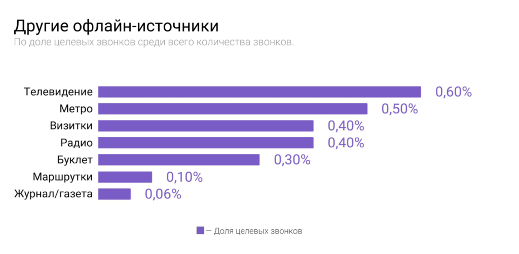 Доли других офлайн-источников оказались ниже: телевидение (0,6%), реклама в метро (0,5%), радио (0,4%) и пресса (0,06%).