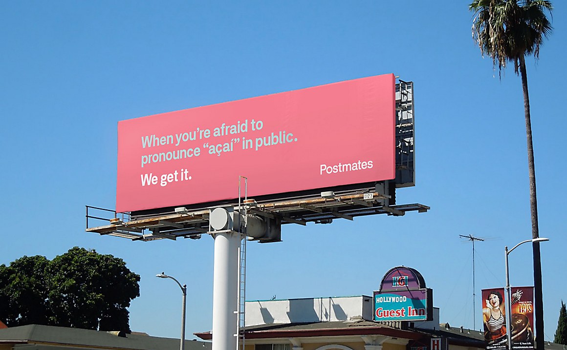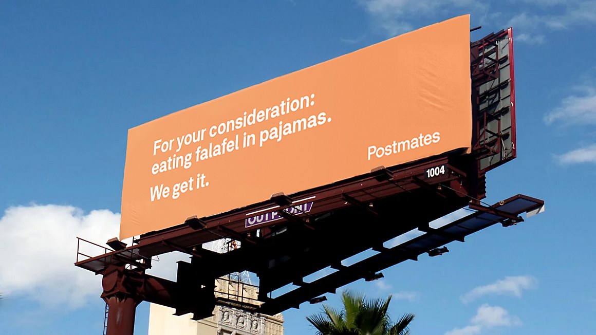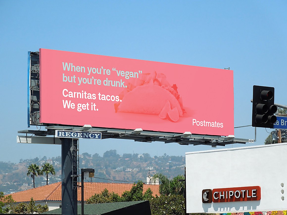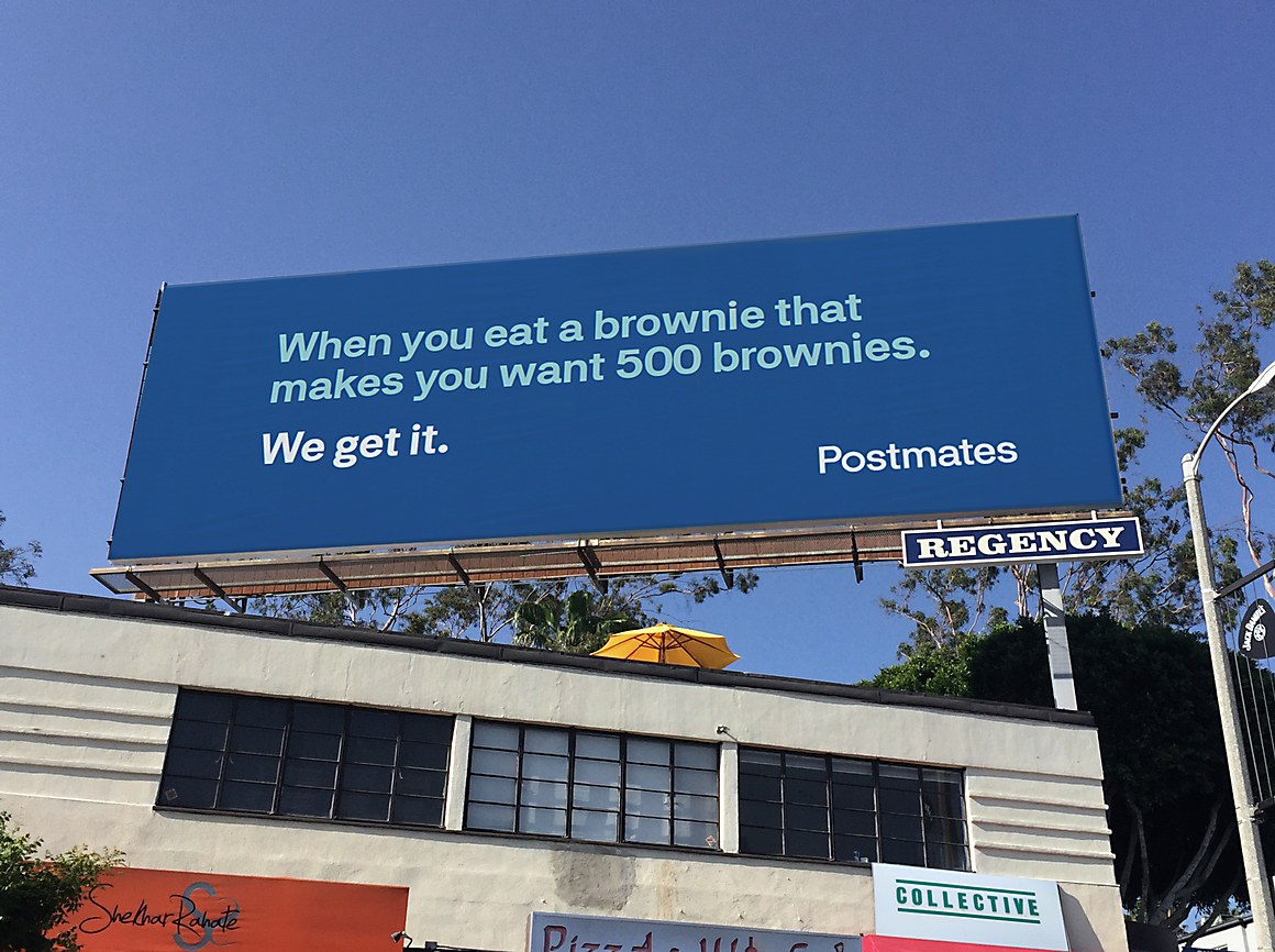 Американская служба доставки товаров Postmates запустила в январе 2018 года первую имиджевую кампанию в наружной рекламе. В ней бренд ловко жонглирует инсайтами в образ жизни лосанджелесцев, основой которого является что-угодно-по-запросу.