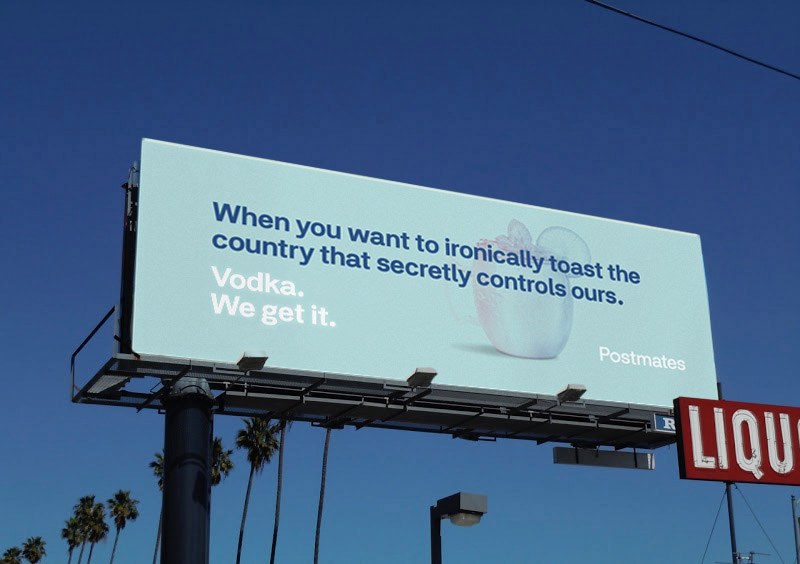Так, один из рекламных сюжетов гласил: «Когда хочешь иронически провозгласить тост за тайно управляющую нами страну. Водка. Мы вас понимаем (читай, мы это доставим)». Его идея родилась, когда из аналитики Postmates стало видно, что жители Города Ангелов заказывают водку в два раза чаще другого спиртного. А в день, когда бывшему советнику президента США по национальной безопасности Майклу Флинну предъявили обвинения в попытке обмануть ФБР, заказы на доставку водки и вовсе выросли на 28%.