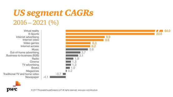 Согласно отчёту PwC Global, доход от мобильной рекламы в 2017 году позволил интернету обогнать телевидение и тем самым произвести переворот на рынке. Темп роста рынка развлечений составляет приблизительно 4,2%, в 2017 году общий объём равен 1,8 трлн $. Среднегодовой темп до 2021 года, ожидается, составить 9,8%.