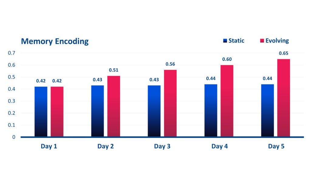 Исследование показало, что перенос в долговременную память, во многом определяющий эффективность кампании, происходит активнее у тех, кто контактирует с рекламой бренда, которая с течением времени меняется. Выяснилось, что обновляющийся креатив к пятому дню экспонирования оказывает на 38% большее воздействие, чем статичный креатив.