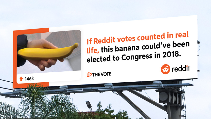R/GA, ставшее головным агентством «Реддита» в феврале этого года, создало серию сюжетов для наружной рекламы, в которых сопоставляется количество позитивных оценок некоторых постов и то, как такое же количество голосов избирателей может повлиять на выборы.