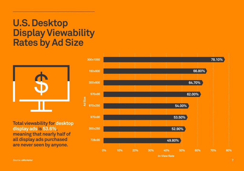 В последние годы огромное внимание уделялось тому, чтобы «поставленная» реклама была в действительности видимой. Стандарт видимости Media Rating Council предполагает, что не менее 50% пикселей рекламного сообщения должны находится в видимой области экрана не менее одной секунды. Несмотря на столь низкое пороговое значение, видимость десктопной медийной интернет-рекламы в целом составляет всего 53,6%, согласно данным eMarketer, представленным в отчете AppNexus.