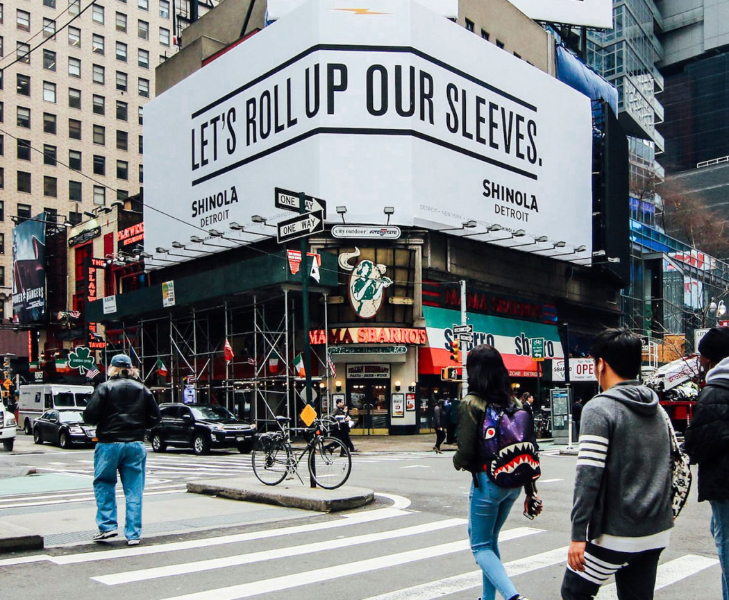 В марте компания Shinola провела в Нью-Йорке OOH рекламную кампанию, в которой обратилась к старомодной добродетели «упорного труда», демонстрируя при этом дух стартапа, для которого важно воздаяние комьюнити.