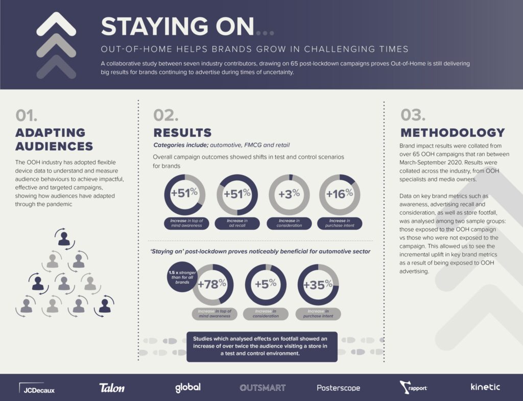Исследовательский проект британской отрасли out of home рекламы, основанный на анализе результатов 65 кампаний, проведенных с марта по сентябрь 2020 года, показал, что те бренды, которые в карантин продолжали размещаться в OOH медиа, достигли высоких показателей: в среднем запоминаемость рекламы увеличилась на 51%, а намерение совершить покупку — на 16%. Результаты настолько убедительны, что выдерживают сравнение с тем, что было до карантина — эффективность OOH кампаний за этот период не снизилась.