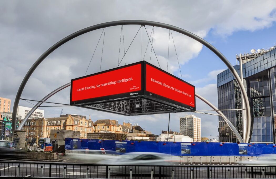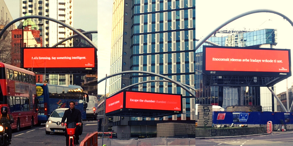 В январе, на неделе, когда Великобритания покинула Евросоюз, «Экономист» оккупировал рекламой Канэри-Уорф и кольцевую развязку на Олд-стрит. Постеры в характерной для издания стилистике «белый текст, красный фон» были заметны со всех улиц, ведущих к станции метро «Олд-стрит». Разгадывание зашифрованного послания позволяло прохожим поиграть интеллектуальной мышцей и намекало на то, что они достойны входить в клуб читателей «Экономиста».