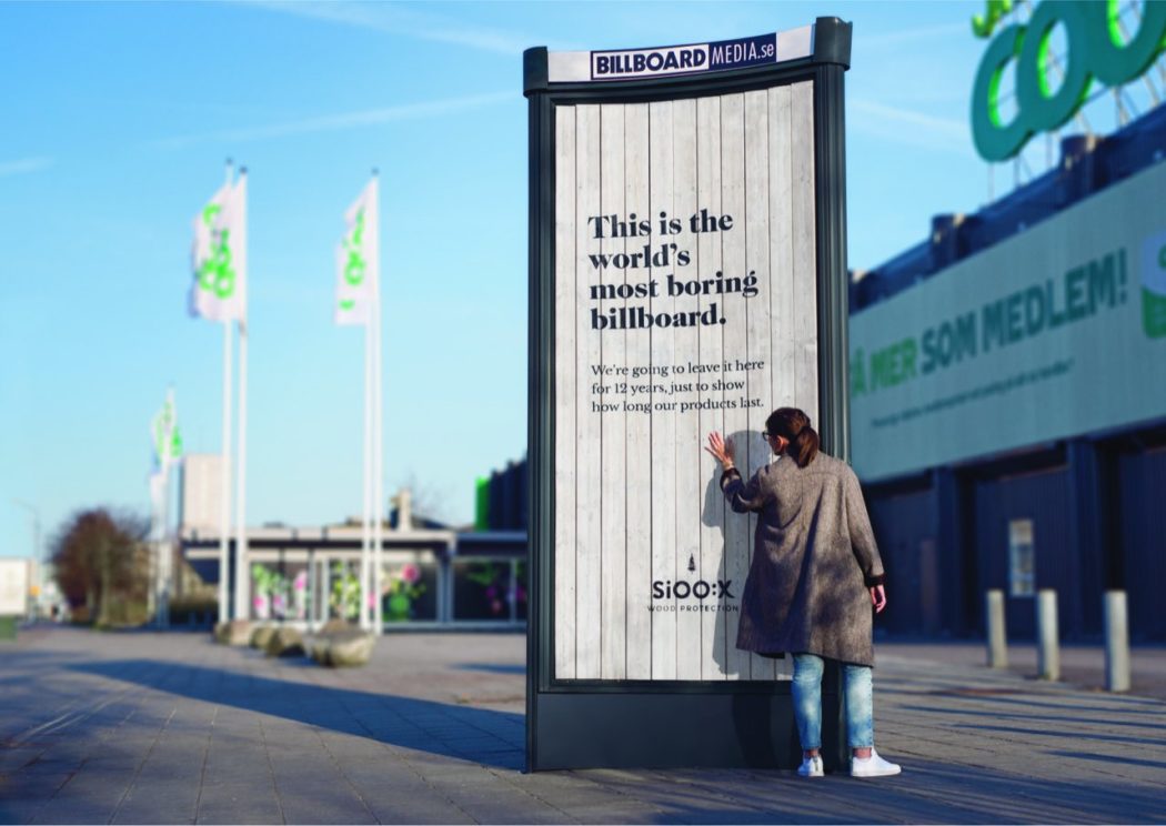 Шведский производитель средств для защиты древисины Sioo Wood Protection AB обещает, что его продукция сохраняет свойства 12 лет. Для подтверждения своих слов компания взяла в долгосрочную — все те же 12 лет — аренду рекламную конструкцию рядом с торговым центром в Мальме и разместила на ней необыкновенно скучную рекламу.