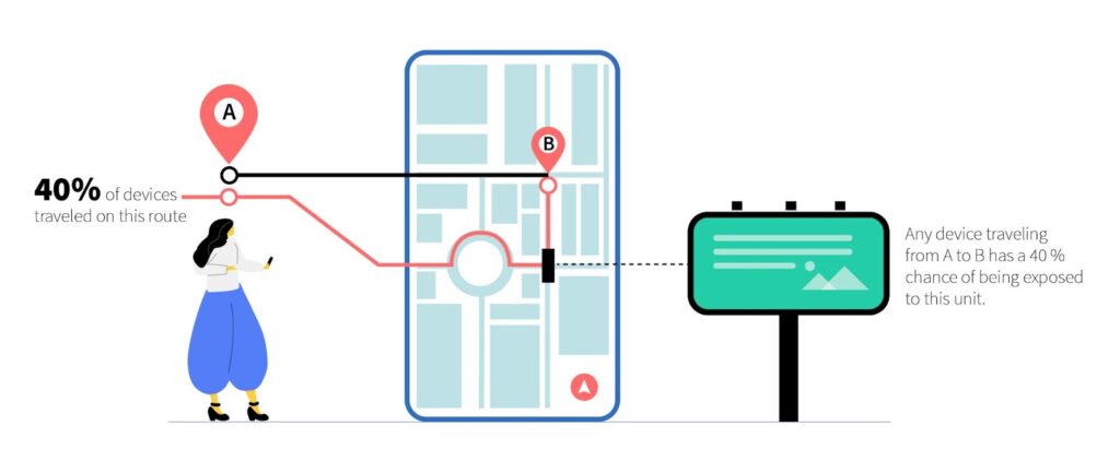 Для более точного понимания результатов кампаний и создания более эффективных стратегий специалисты по OOH-рекламе могут определять маршруты аудиторий на основе данных о местоположении мобильных устройств. Сочетая эти данные с информацией о рекламных локациях, мы приходим к оценке аудитории рекламных конструкций.