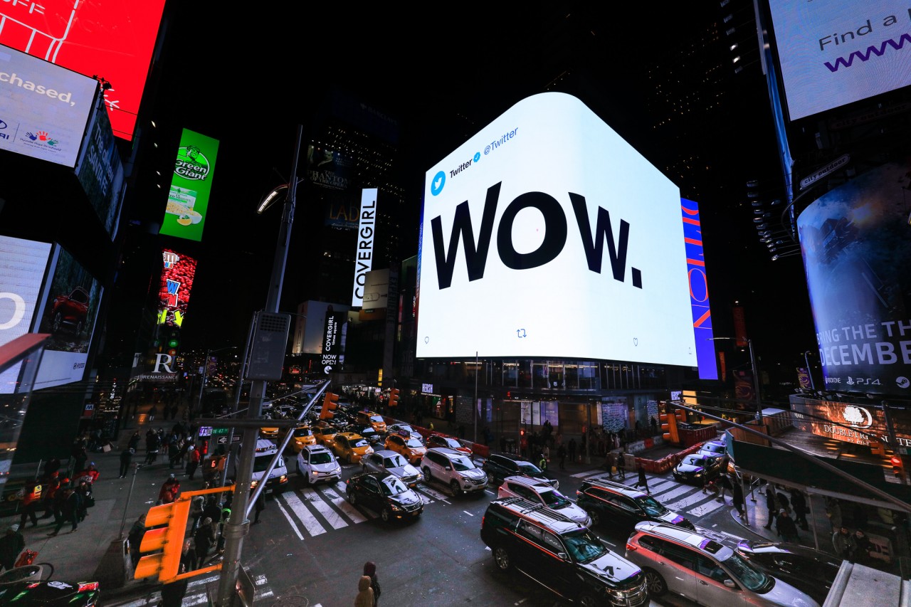 Twitter запустил наружную рекламу на Таймс-сквер в Нью-Йорке, чтобы прорекламировать свежий и дерзкий тон флагманского аккаунта @Twitter. На билбордах демонстрируются реальные твиты аккаунта. Их цель — отразить «более легкую и разговорчивую природу» бренда Twitter.