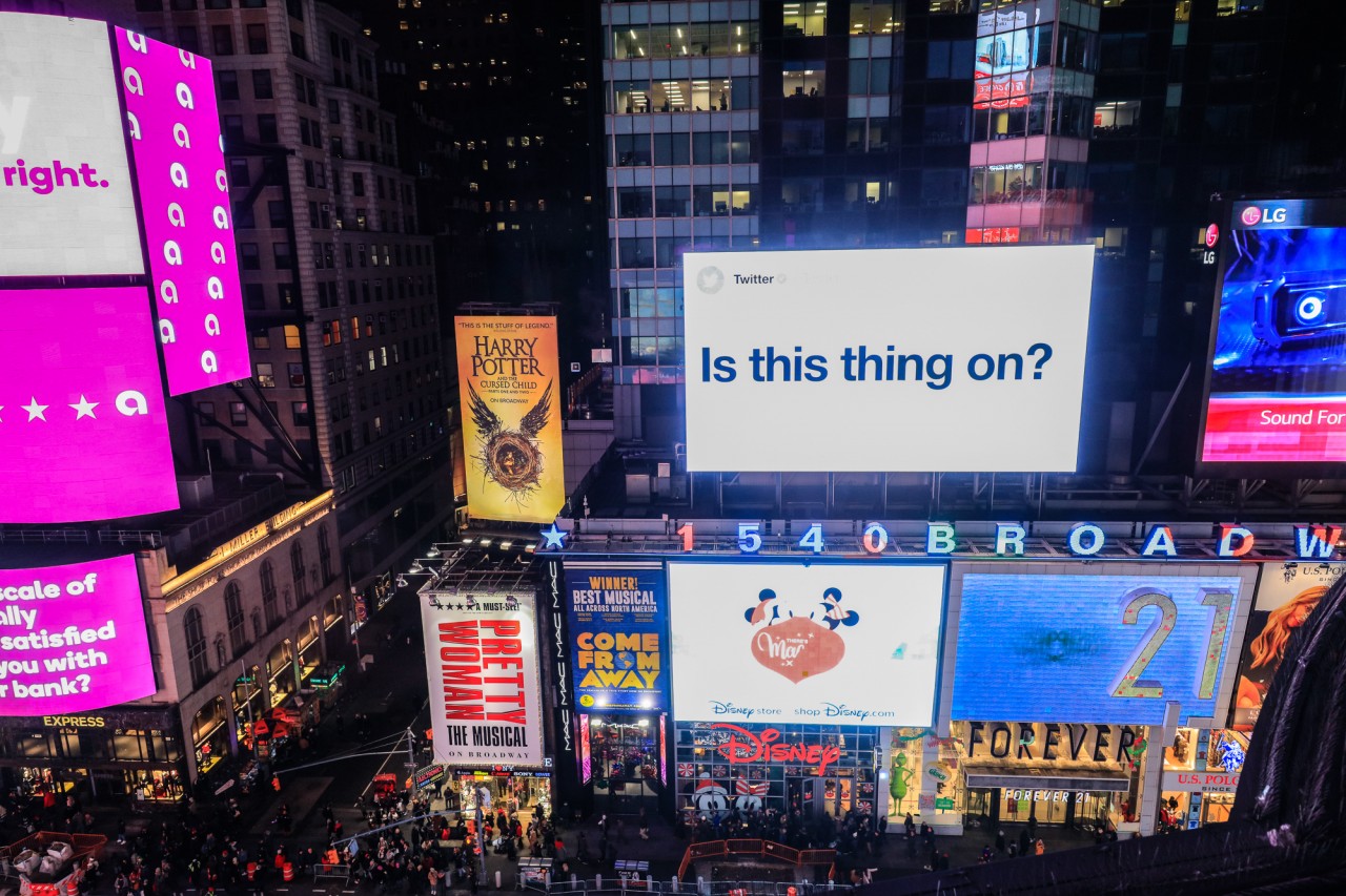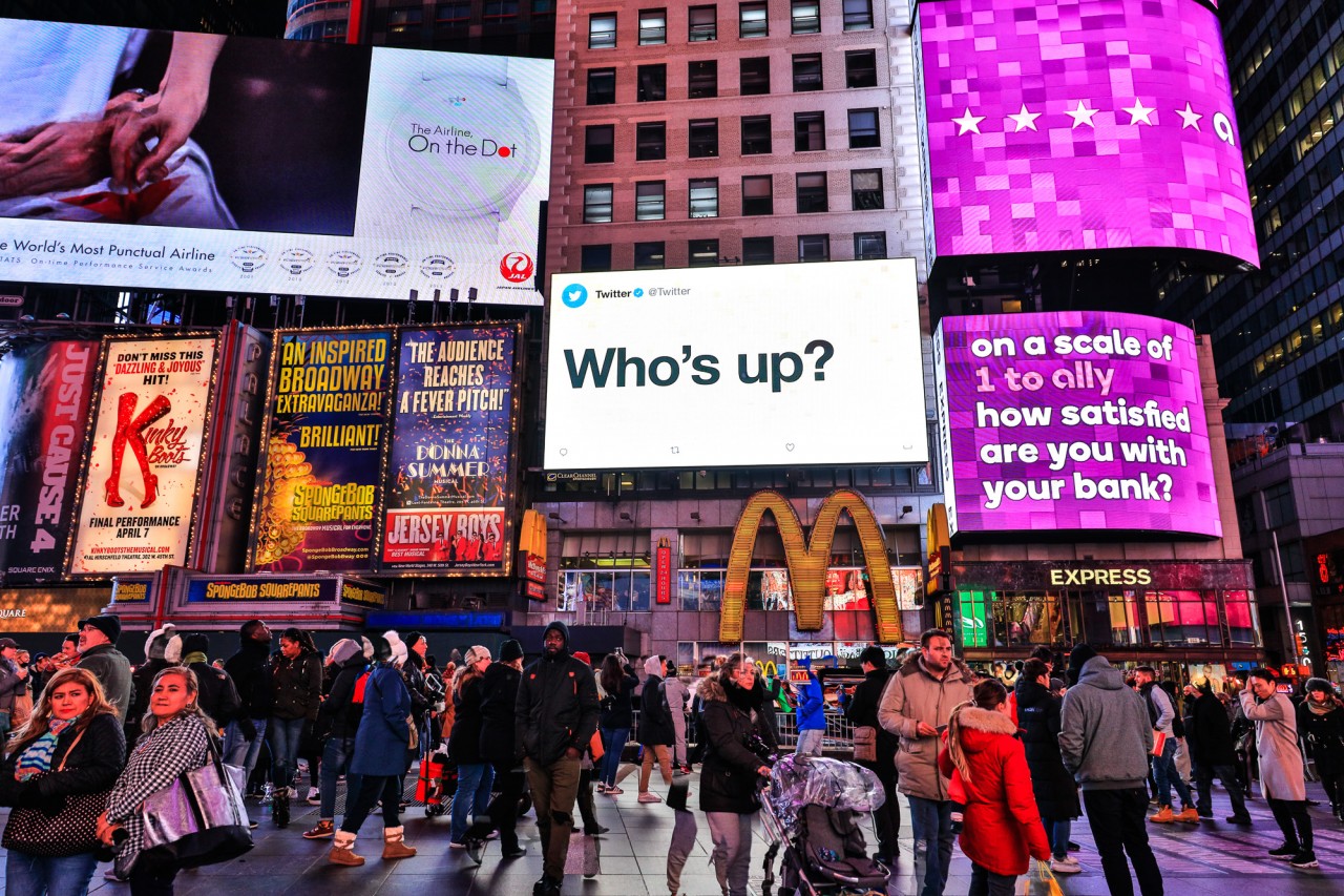 Год назад Твиттер изменил формат общения через официальный аккаунт @Twitter. Чтобы рассказать об этой перемене и новом дерзком корпоративном голосе Твиттер провел на Таймс-сквер кампанию с сюжетами, основанными на реальных твитах. Как сообщается в пресс-релизе, эти твиты отражают «более легкую, более разговорную природу» бренда. Как выразился представитель компании, «Нам понравились собственные твиты, поэтому мы их увеличили».