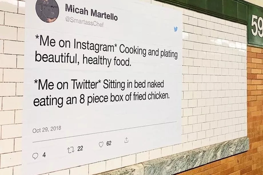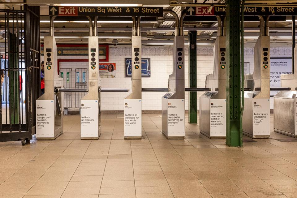 Этим летом социальная сеть провела кампанию «Me on Twitter». В основу сюжетов легли твиты, противопоставляющие то, как люди пользуются Твиттером и другими соцсетями. 128 постеров (31 сюжет) разместили на шести станциях метрополитена Нью-Йорка и Сан-Франциско. Чтобы привлечь к маркетинговой коммуникации дополнительное внимание официальный аккаунт компании в Твиттере разфоловил всех, кроме пользователей, участвовавших в OOH-кампании.