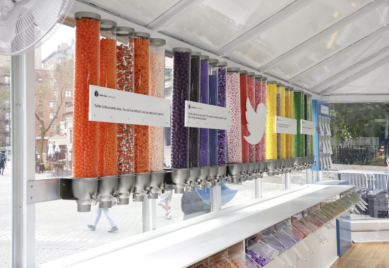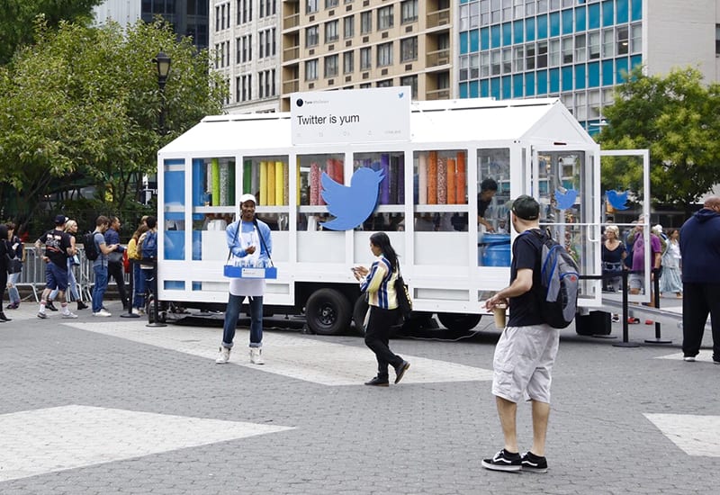 В сентябре в рамках маркетинговой коммуникации «Twitter Is» компания установила в Нью-Йорке на площади Юнион-сквер временную торговую точку со сладостями. Было роздано около полутонны сладостей: мармеладных мишек, леденцов-завитков, печенья с предсказаниями, леденцового сахара и попкорна.