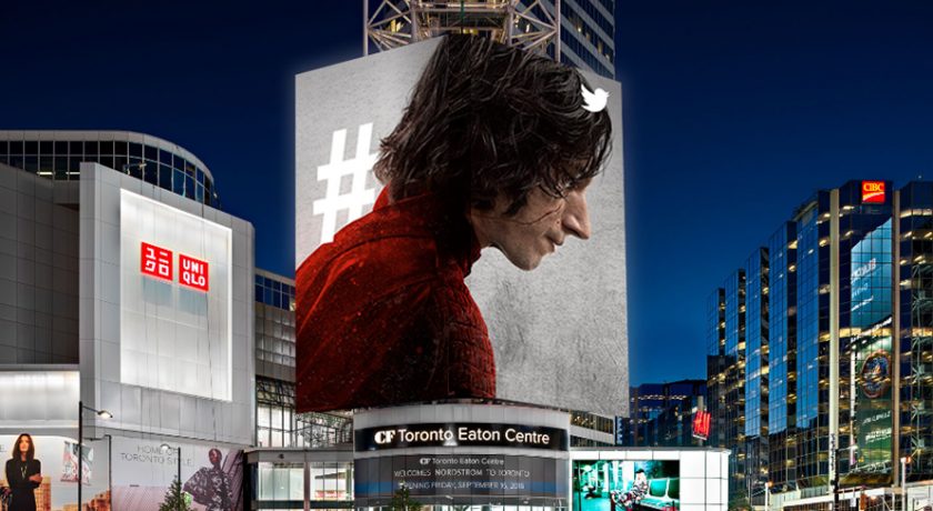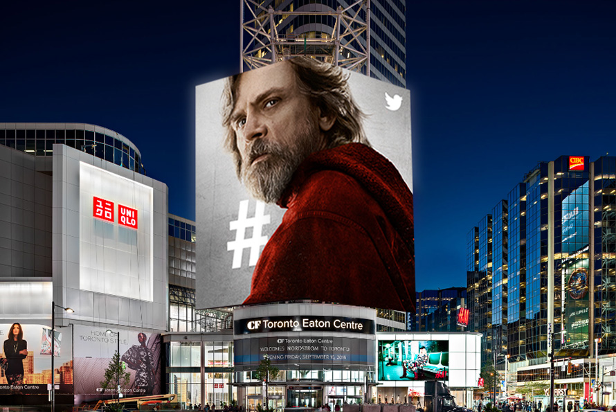 15 декабря с десяти утра до десяти вечера гигантские билборды Итон-Центра в Торонто показывали промо-материалы «Последних джедаев» в сопровождении тематических сообщений, в прямом эфире выуживаемых из Твиттера. Это же происходило на билбордах Таймс-сквера и Брайант-парка в Нью-Йорке.